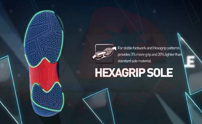 HEXAGRIP SOLE: Để có động tác chân nhanh nhẹn và ổn định, họa tiết hình lục giác cung cấp độ bám nhiều hơn 3% và nhẹ hơn 20% so với chất liệu đế tiêu chuẩn.